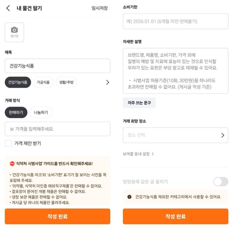 당근과 번개장터 등 중고거래 플랫폼도 자체적인 관리에 노력을 기울이긴 마찬가지다. 우선 당근은 중고거래 플랫폼 이용자가 건강기능식품 판매 시 본인 인증 과정을 거치도록 조치했다. 이를 통해 거래 허용 횟수(1년간 10회, 누적 30만원 이하)를 초과할 경우 게시글을 등록할 수 없다. 번개장터는 건강기능식품 항목의 게시물을 작성할 때 반드시 소비기한을 입력하도록 조치했다. 개인이 판매하는 건강기능식품 항목 게시물의 재고 수량도 1개로 제한해, 이를 위반할 경우 빠르게 대응하고 있다.
