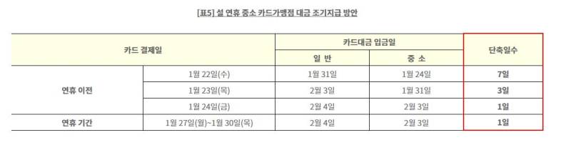 카드업계는 중소 카드가맹점에 대해 가맹점 대금을 최대 7일 먼저 지급한다. 46만2000개 중소 가맹점에 대해 별도의 신청 없이 연휴 이전 또는 연휴 기간 발생한 카드 결제대금을 신속히 지급할 계획이다. 또한 대출과 공과금의 상환만기가 자동연장 된다. 금융회사 대출의 상환만기가 설 연휴 중 도래하는 경우에는 연체이자 없이 만기가 오는 31일로 자동 연장된다.